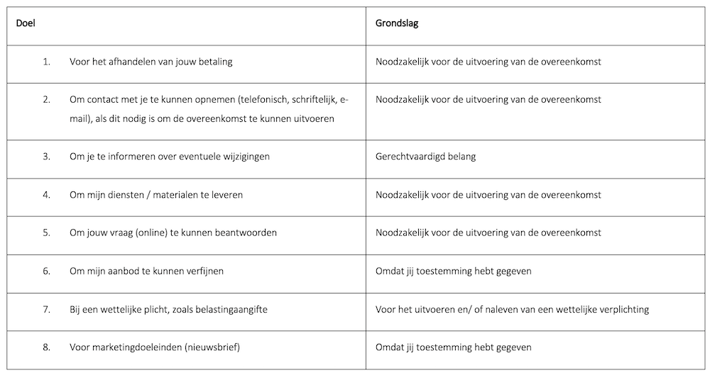 Bij ieder doel moet een grondslag bestaan, zoals hieronder weergegeven: