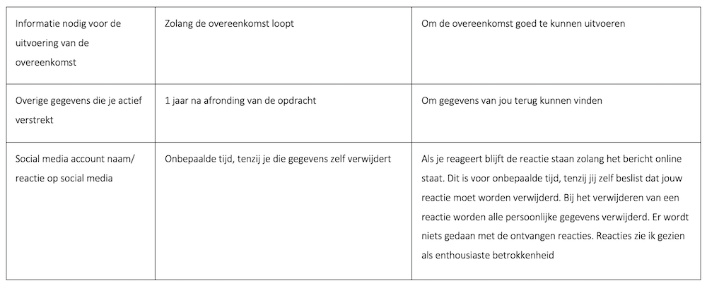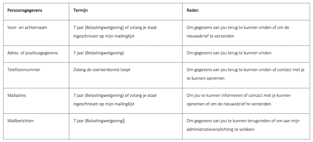 Ik bewaar jouw (persoons)gegevens niet langer dan strikt noodzakelijk om de voorgenoemde doelen te realiseren, waarvoor je gegevens worden verzameld. Ik hanteer de volgende bewaartermijnen: