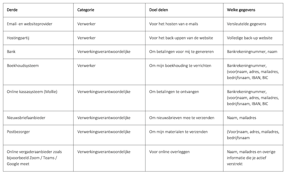 Hieronder tref je een overzicht van de persoonsgegevens die ik van jou kan verwerken. Onderstaande gegevens heb je zelf aan mij gegeven, ze zijn af te leiden uit openbare registers zoals het handelsregister van de Kamer van Koophandel of ze zijn uit andere openbare bronnen te herleiden, zoals bijvoorbeeld social media-accounts.